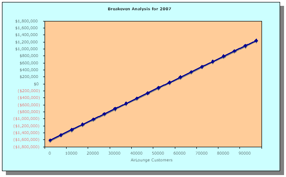 The following graph shows Air Lounge’s breakeven point when profits equal $0. At this point the company will have generated just enough revenue all its costs. Any dollar earned after this pint will go directly to net income.