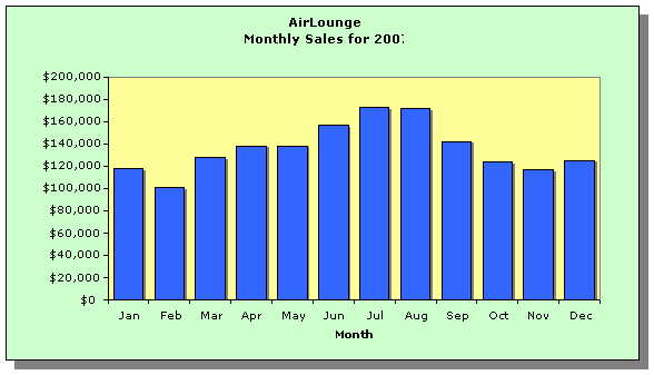 The following graph illustrates sales revenue fluctuations during the first year. Air Lounge is to generate higher revenues during the summer when airport traffic is at its highest levels.