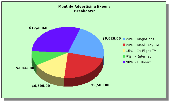 This pie chart details Air Lounge’s marketing expenses on a monthly basis.
