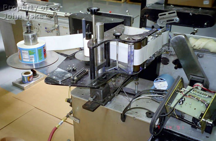 A bottle feeds through a transport channel and a label tacks onto the bottle a wraps around it